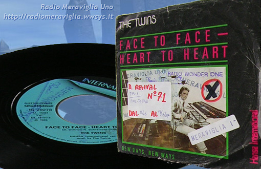 Disco Revival n°71 dal 11/06 al 14/06/1987. Gruppo: *Twins* - brano: *Face to face*. The Twins è un gruppo musicale tedesco di genere synth-pop degli anni '80. Il gruppo è stato formato nel 1980 a Berlino Ovest da Sven Dohrow e Ronny Schreinzer. Musicalmente ispirati ad artisti britannici come Gary Numan, Tubeway Army, e Orchestral Manoeuvres in the Dark.
