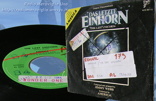 Disco Revival n°179 dal 16/08 al 19/08/1988. Gruppo: *America* - brano: *Tha Last Unicorn*. La partitura musicale e le canzoni sono state composte e arrangiate da Jimmy Webb, ed eseguite dagli America con le voci aggiuntive fornite da Lucy Mitchell. Il film ha ottenuto 2,25 milioni dollari nel suo primo weekend di apertura.