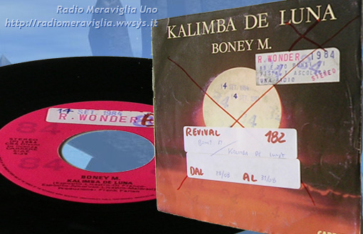 Disco Revival n°182 dal 28/08 al 31/08/1988. Gruppo: *Boney M* - brano: *Kalimba De Luna*. I Boney M. sono un popolare gruppo musicale disco, europop ed eurodance formato da quattro cantanti e ballerini caraibici diretti dal produttore discografico tedesco Frank Farian (Franz Reuther) che, non di rado, forniva la sua voce per alcuni brani.