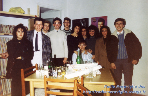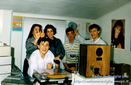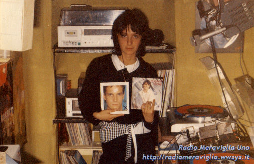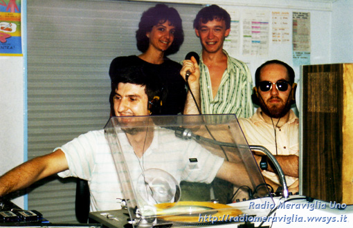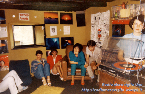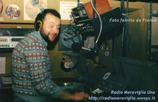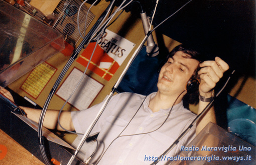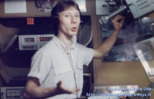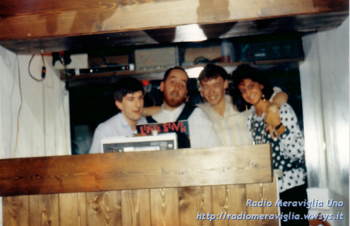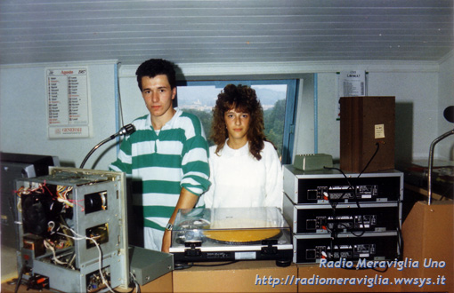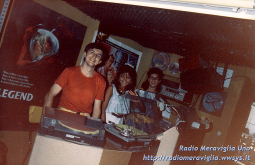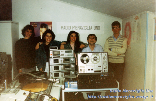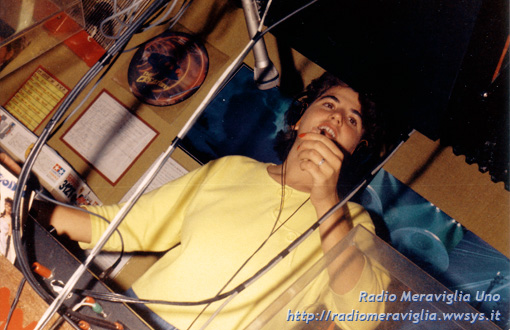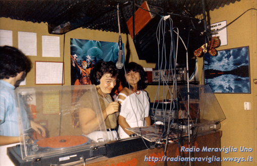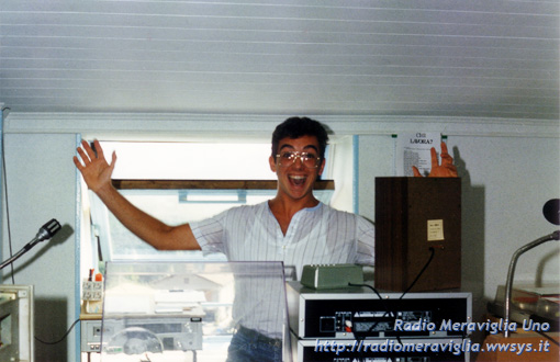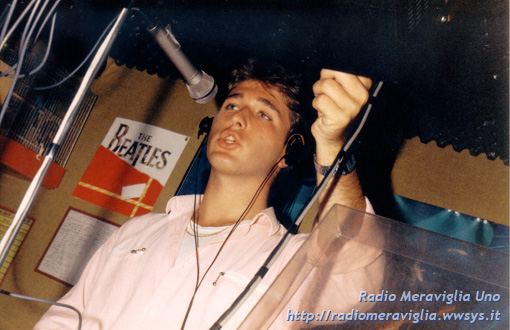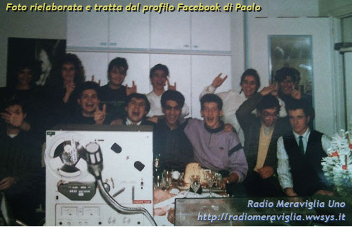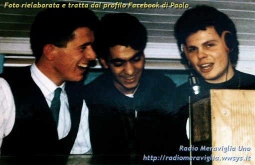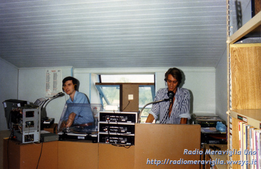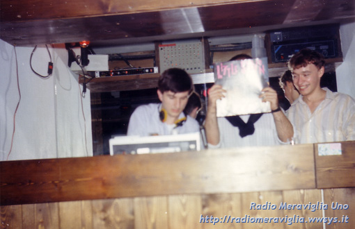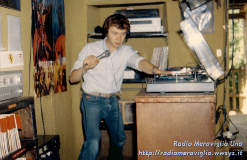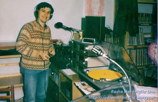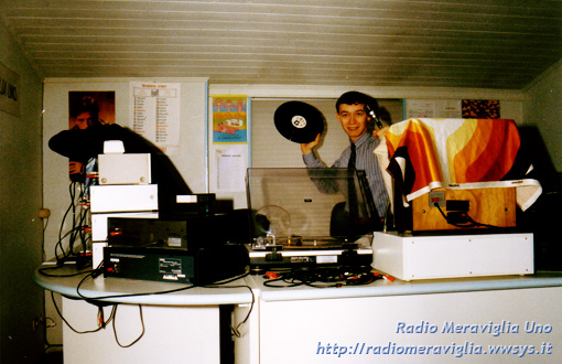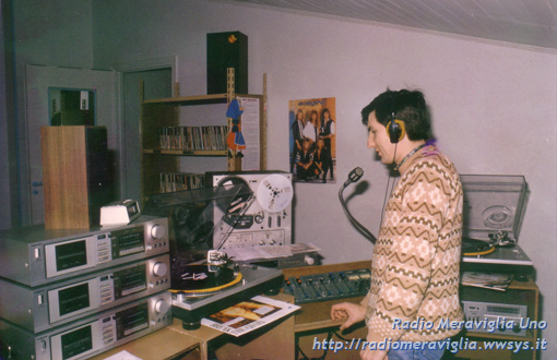 Claudio, fratello di Paolo in diretta dal primo studio della radio, sulla foto a destra incollati alla porta il °Quadrifoglio° e il °Cavalluccio Marino° diventati i simboli di °Radio Meraviglia Uno° (Radio Wonder One). In alto sempre a destra appeso sopra il cassone nero °l'encorer stereo° assemblato da Graziano, che ha permesso di essere localmente tra i primi, a trasmettere in Stereo.