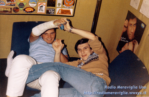 Dj Paolo e Dj Gigi, in uno dei loro programmi in coppia, in una delle loro fasi più creative... Nella cara vecchia "Radio Meraviglia" ultima sede.