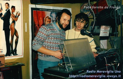X DJ e Paolo in diretta radio, in quella che era °Radio Meraviglia° un passo avanti. Da questa angolazione è più visibile il bancone di lavoro rinnovato e allungato (realizzato da Graziano), i nuovi giradischi professionali per DJ °Technics SL1200 Mk2°, in dotazione nelle migliori discoteche, e le locandine (poster) dei film (tra questi Legend e Terminator) gentilmente forniti da Franco.
