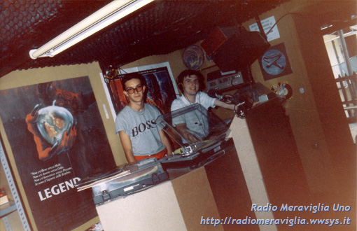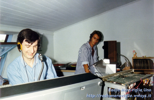 Paolo e Filippo a doppia console, in un programma in diretta e in coppia, nell'ultima sede di °Radio Meraviglia Uno° (non ancora allo splendore finale). Banconi in legno verniciato e dischi anche se ben riposti, ancora in scaffalature metalliche a vista.
